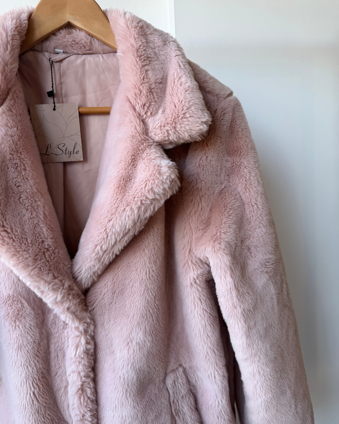 A plush pink faux fur coat with a soft, feminine feel. Warm, pink and perfect for adding a touch of glamour to winter outfits.