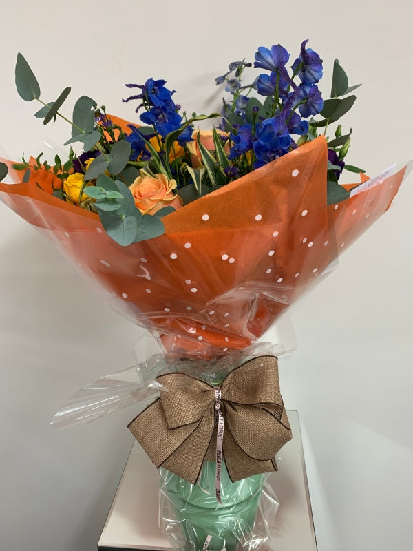 The perfect mix of bright seasonal flowers with complimentary foliage. This is an aqua pack bouquet, delivered in water.