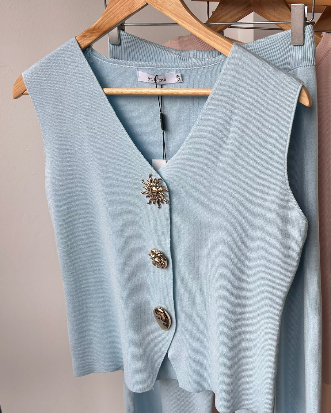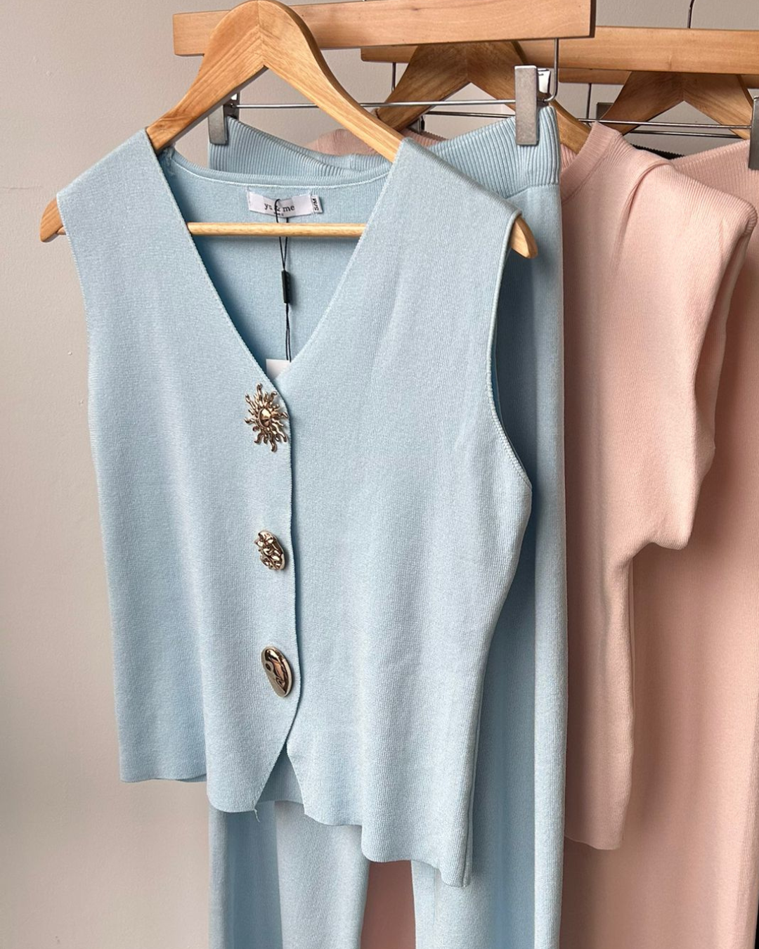 Elevate your wardrobe with this stunning two-piece knitted set in a gorgeous sky blue.