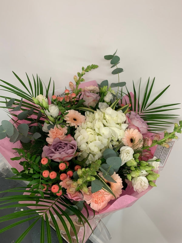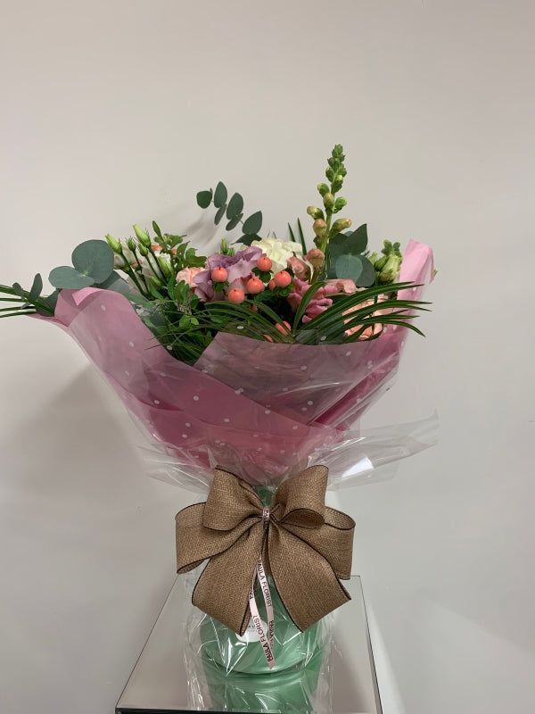 The perfect mix of pretty seasonal flowers with complimentary foliage. This is an aqua pack bouquet, delivered in water.